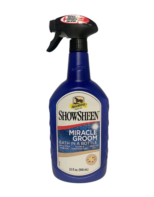 ShowSheen Miracle Groom Bath in a Bottle by Absorbine is a water-free shampoo spray that cleans your horse while conditioning and adding shine. Great for manure or urine stains or a quick clean up during cold weather, Miracle Groom conditions the coat, detangles manes and tails and leaves your horse smelling fresh.