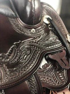 Endorsed by Julie Goodnight, the noted clinician and trainer, The Circle Y Wind River Flex2 Saddle features the innovative technology you want in a trail saddle with the beautiful craftsmanship you’ve come to expect from Circle Y Saddles. Designed with the comfort of both horse and rider in mind, this fantastic Trail Saddle requires almost no break in time and promotes balanced riding. Not only that, it is drop dead gorgeous! The lavish hand tooling, black seat, and walnut leather add up to a luxury look that suits the high end performance.