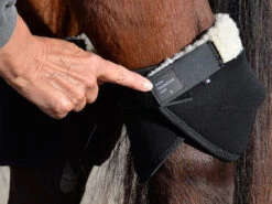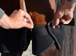 To find your horse’s correct size, have the horse stand with its leg straight and hoof flat on the ground. Measure the smallest area just above the hock joint and compare to the size guide. Do not size up! The elastic straps will stretch so it’s better to have a slightly too small fit at first.Â