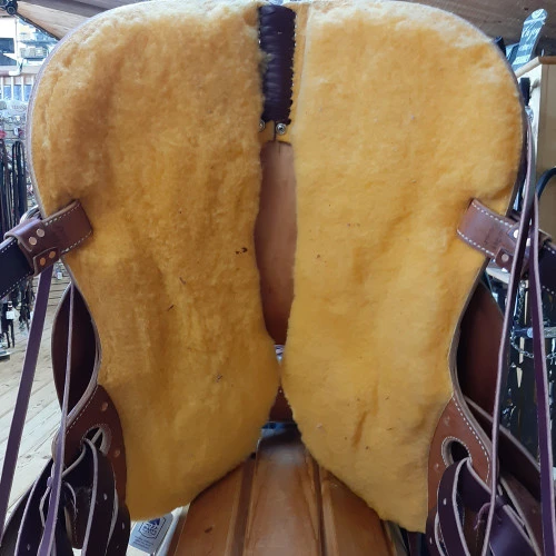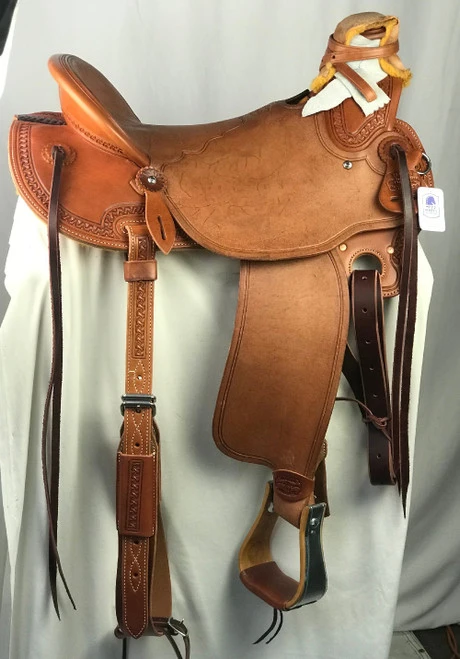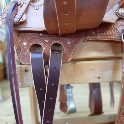McCall McLite Saddle is well suited to western dressage. It is light and engineered for a close contact feel and greater communication between horse and rider. Hand shaped deep seat is secure. Popular, too, with Buck Brannaman-style natural horsemanship for many of those same reasons. The saddle is easy to lift and light on the horse, so appropriate for horses and riders with physical considerations. Valley Manufacturing stirrups are galvanized oak with leather tread. Matching tooled 3 Piece Flank Cinch Set is included. Latigo and generous saddle strings.