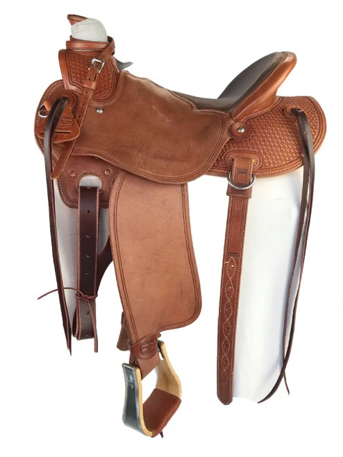The McLite Wade Saddle from McCall Saddle Co.is a durable, traditionally styled Western saddle that weighs less than 25 pounds! No, it’s not synthetic – the secret is in the lightweight, extremely strong tree. This American made saddle uses a space age technology to create a light weight, comfortable saddle for trail, pleasure, and more. The trees are all made with a Quarter Horse gullet 6 1/2″ wide by 7 1/2″ high. The cantle is 4″ high by 13″ wide. Three inch wrapped horn. Roughout leather for traditional rugged good looks. Hamley flat plate rigging.