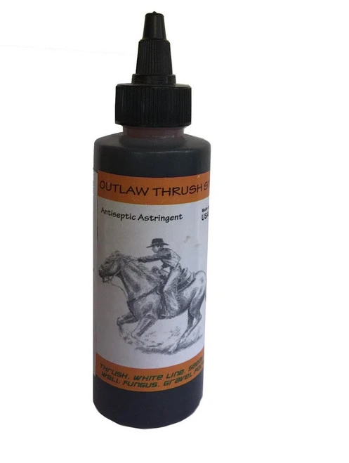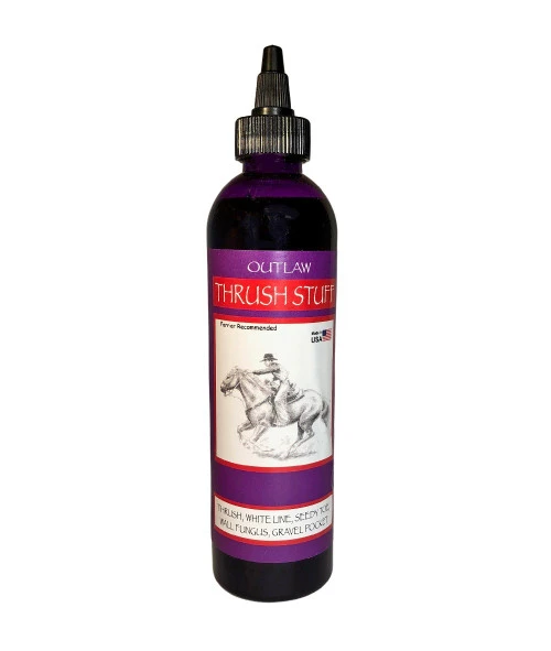 Outlaw Thrush Stuff is an antiseptic and astringent solution that treats thrush in horses’ hooves quickly and safely. Outlaw Thrush Stuff eliminates the fungus and bacterial infection that weakens hooves and causes discomfort and lameness. This made-in-USA formula for horse hoof health works fast to get your horse more comfortable. Thrush is unpleasant and progressive so treating it effectively is key.