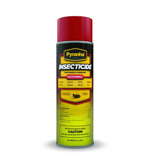 Pyranha Aerosol Insecticide Spray for horses kills and repels flies and other insects, keeping your horse happy. Pyranha Spray contains lanolin to keep your horse’s coat gleaming and has a nice citronella smell. This fly spray is effective against mosquitoes, face flies, fleas, gnats, roaches, ants, ticks, chiggers and biting flies including horse flies, stable flies, house flies, horn flies and deer flies.