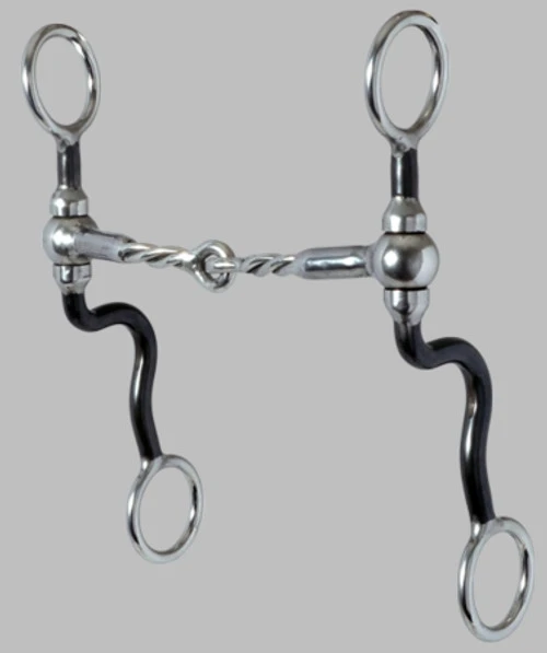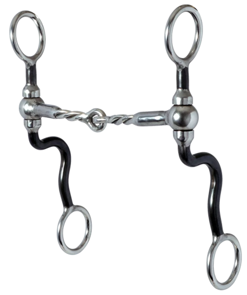 Reinsman gorgeous Black Tie Snaffle Bit at Marystack.com! This bit combines smooth & twisted snaffle mouthpiece with 7″ Cheeks and 5″ Mouth. The Black Tie snaffle bit with its “no pinch” ball design is one of Reinsman’s premier designs. We love the clean, sleek look of the black & silver shanks. The smooth swiveling cheeks help moderately control shoulders and ribs. Reinsman’s Charlie Green mouthpiece was the go-to mouthpiece for the great trainer, and is a great tune-up bit prior to snaffle bit events. By combining two great snaffles you get the best of both. The smooth section is soft over the bars and mild on the lips, while the twisted center helps sensitize the tongue when needed.